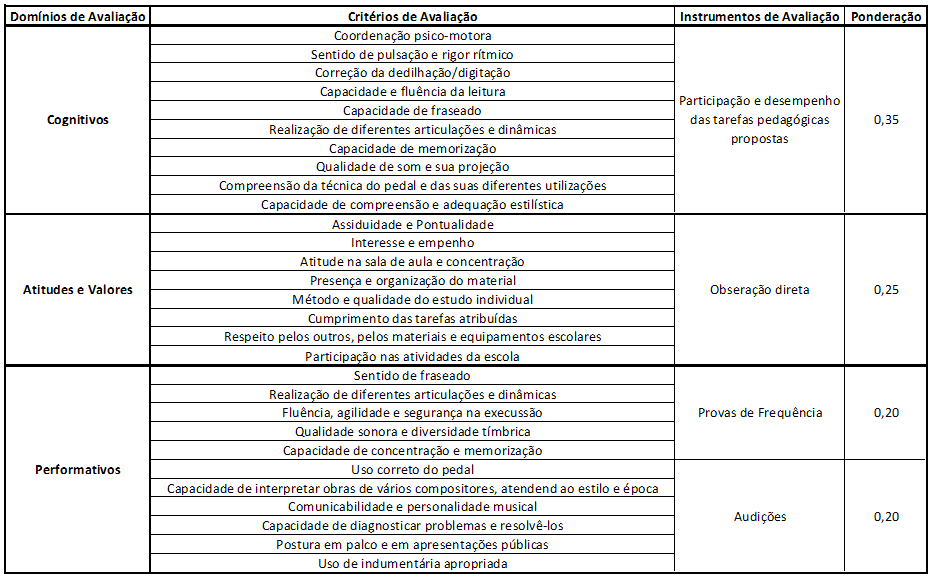 Já no que diz respeito à avaliação de piano, todos o alunos foram avaliados com aproveitamento tendo em conta os seguintes critérios: